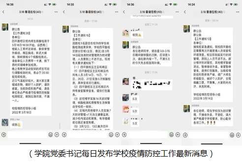 3月9日到今天,学院召开2场全院大会、1场教师代表大会、1场全院党员大会、1次支部书记会、1次专题组织生活会、5次党政联席会、4次党委会、每天一次的学院疫情防控通气会、20余场与不同楼宇、不同年级学生的线下慰问、线上视频会等。刘颂每日发布学校疫情防控小组最新消息,及时与师生沟通,以便留校师生及时了解学校所做的努力、工作通报、核酸检测、生活信息等,不信谣,不传谣,共同营造科学防治、理性应对的社会氛围。