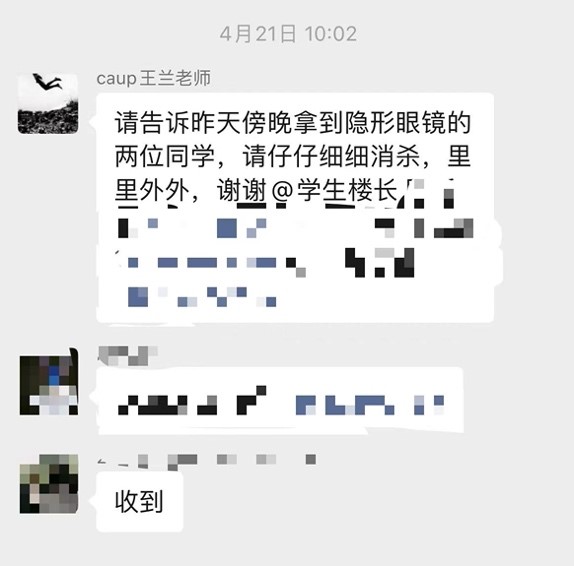 在这一栋有着575名学生的宿舍楼里,学生们有着各种情况,王兰都竭尽全力帮助解决同学们的困难,比如学生的助听器电池和隐形眼镜等必备生活物资需要进行更换,她积极和学校保持沟通,最终顺利帮助大家解决困难。