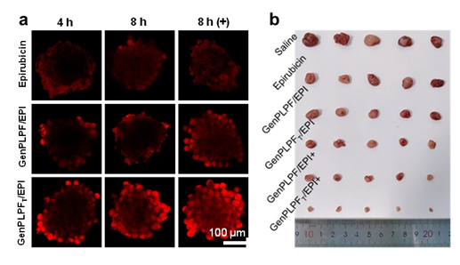 图2:(a)体外三阴性乳腺癌模型模拟多肽纳米凝胶的渗透性能;(b)体内抗肿瘤效果。