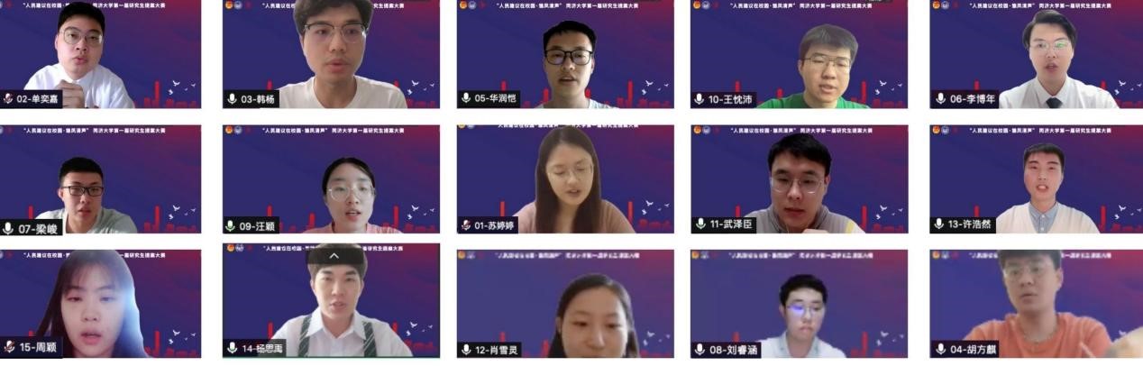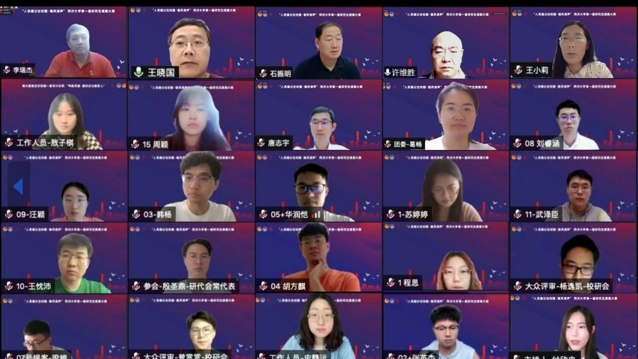 6月24日,2022年度同济大学“人民建议在校园·雏凤清声”第一届研究生提案大赛决赛在线举行。校党委学研工部、校团委、基建处、嘉定校区管委办、信息化办公室、体育教学部、校研究生会相关负责人等出席活动并担任评委,各学院的校研代会代表共同担任大众评审,校常代会代表、各学院研会主席、校研会枫林菁英汇成员参加了活动。