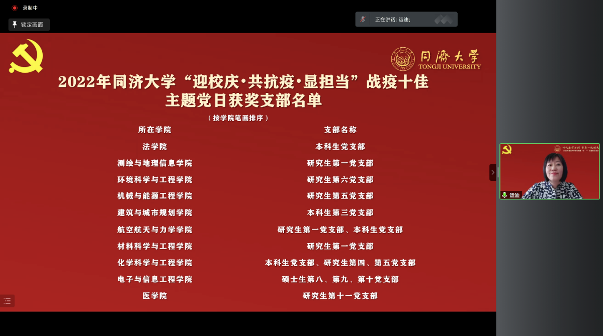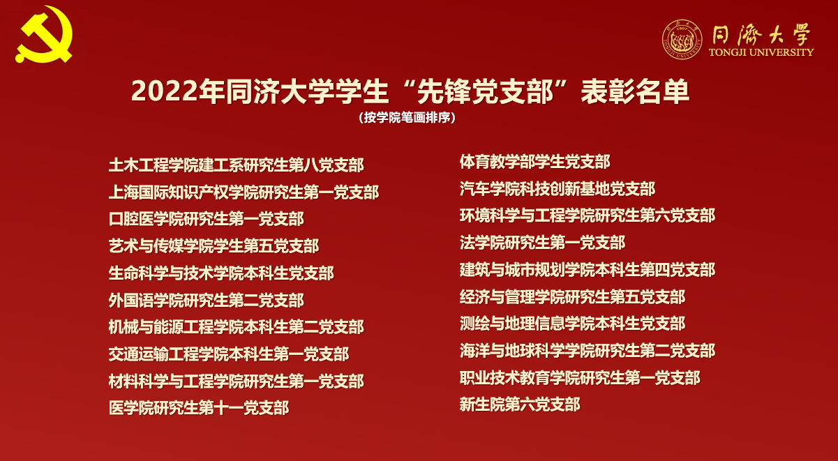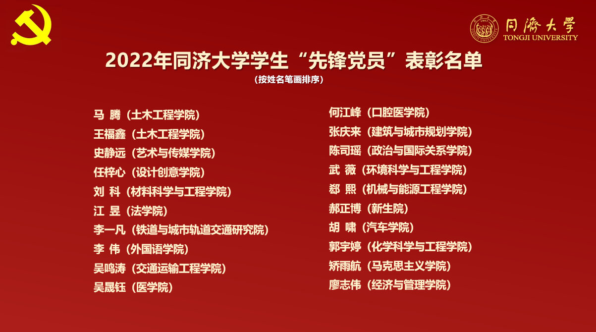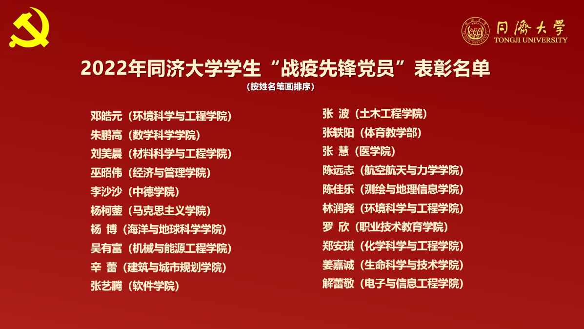随后,彭震伟宣读了2022年同济大学学生先锋党员、学生战疫先锋党员、学生先锋党支部表彰名单。此次,学校共有20位学生先锋党员、20位学生战疫先锋党员、20个学生先锋党支部获表彰。