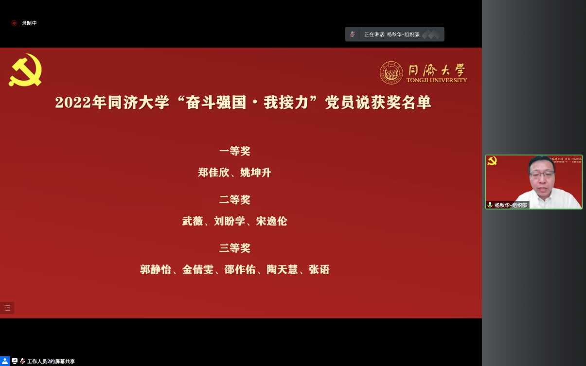 组织部和宣传部相关负责人分别宣读了“奋斗强国·我接力”党员说获奖名单和学生党支部“战疫十佳主题党日”获奖名单。师生共同回顾在疫情期间学生党员冲锋一线的战“疫”故事。
