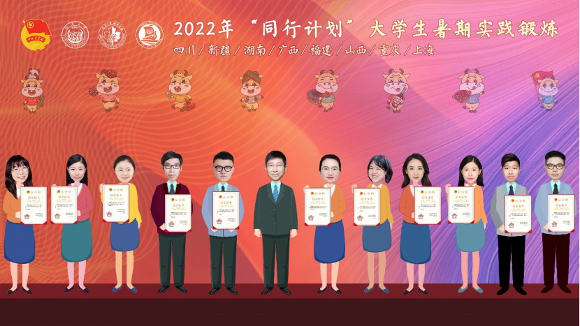 为保障校地合作对接和实践工作高质量开展,各实践地指导老师将从岗位对接、面试遴选、人岗匹配到过程指导、管理考核、评优表彰等全过程参与工作组的各项工作,其中多位老师已经连续数年支持“同行计划”。为此,工作组为指导老师制作了诚意满满的纪念证书作为留念,进行了线上云颁证,并为即将前往各地区实践的团队云授旗,预祝2022年“同行计划”大学生暑期实践锻炼取得圆满成功。