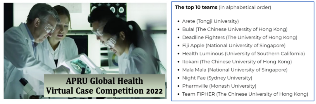 2022年度环太平洋大学联盟(the Association of Pacific Rim Universities,APRU)全球健康虚拟案例大赛(Global Health Virtual Case Competition)于近日落下帷幕。由同济大学医学院王开涛、缪永恩、闫乐、刘童和外国语学院陈仪娴、潘堃玮同学组成的“Arete”团队晋级位列前十名,是本年度中国大陆地区唯一获此殊荣的队伍。