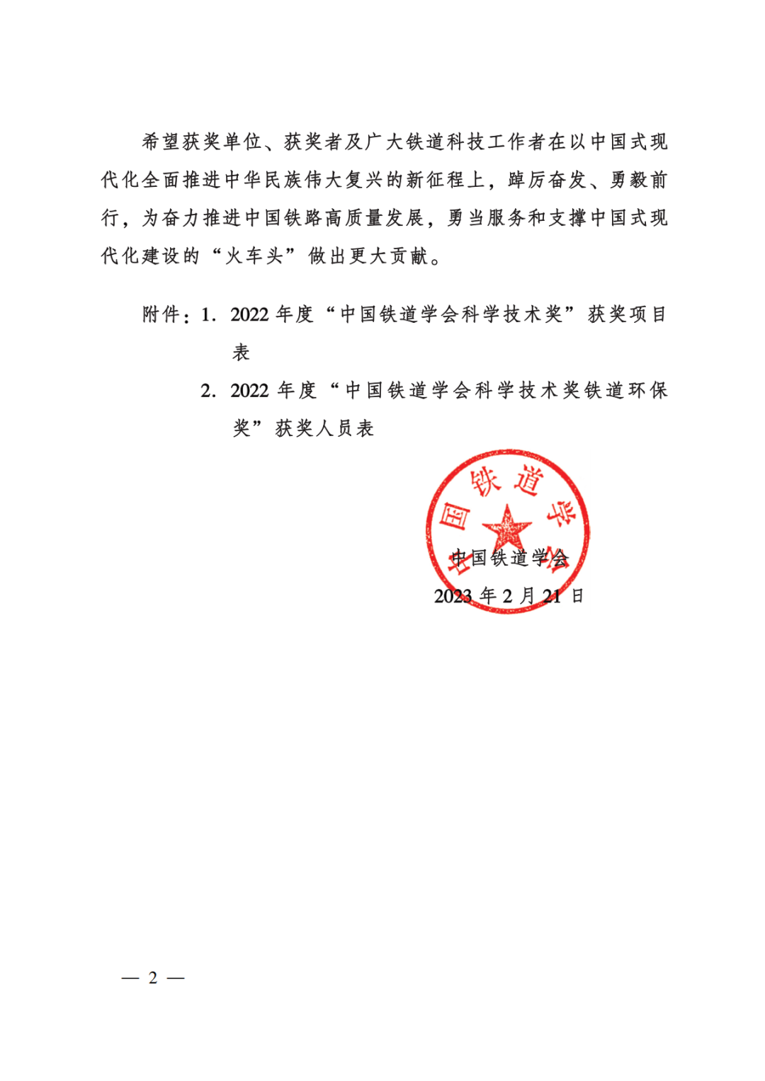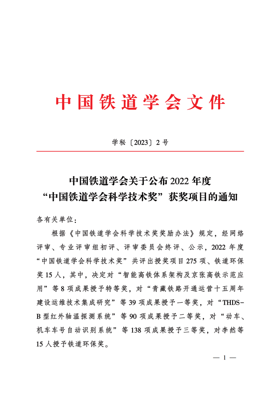 “中国铁道学会科学技术奖”是我国铁路行业科技最高奖项,每两年评选一次,评审面向全国参与铁路行业的所有投资建设单位、科研院所、铁路局、设计院、施工单位等。经专业组网评、专业评审组初评、评审委员会终评审定,授予2022年度“中国铁道学会科学技术奖”特等奖8项、一等奖39项、二等奖90项、三等奖138项。