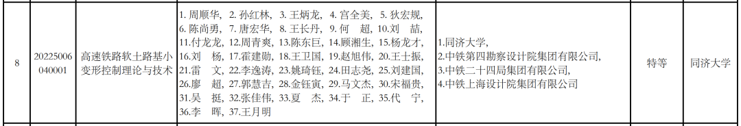 2月23日,中国铁道学会正式公布2022年度“中国铁道学会科学技术奖”获奖项目名单,交通运输工程学院共有6项成果获奖。其中,由同济大学作为第一完成单位,交通运输工程学院周顺华教授作为第一完成人,团队王炳龙、宫全美、狄宏规、王长丹、何超、付龙龙、杨龙才、刘建国等老师作为主要完成人的“高速铁路软土路基小变形控制理论与技术”项目获得中国铁道学会最高奖——科学技术特等奖。这也是学院新世纪以来以同济大学作为第一完成单位的科研成果在中国铁道学会取得的最高奖项。