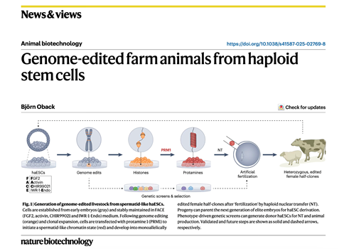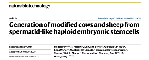 10月7日,内蒙古大学杨磊教授、李光鹏教授与同济大学高绍荣院士团队合作研究成果发表于《自然·生物技术》(Nature Biotechnology),题为“Generation of modified cows and sheep from spermatid-like haploid embryonic stem cells”。该研究创新性建立了“孤雄单倍体干细胞(haESCs)+‘类精子’表观修饰(spermatid-like)+非整合引导编辑(ePE)”三位一体的单倍体育种策略,不仅破解牛羊单倍体干细胞建系和应用核心痛点,更成功培育出MSTN基因编辑牛羊,为反刍动物育种开辟全新路径。此外,杂志同期刊还发了「News & Views」评论文章,重点推荐介绍了这项工作。