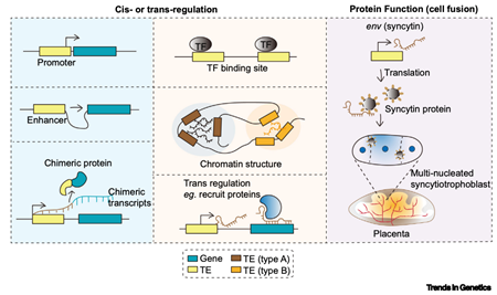 曾被视为“垃圾DNA”的TEs(占灵长类基因组的~50%),在胚胎发育早期经历阶段特异性激活,这绝非偶然,而是扮演着多重关键角色(图3),包括作为顺势调控元件激活下游基因表达,产生嵌合转录本,重组染色质结构,驱动胎盘发育等。