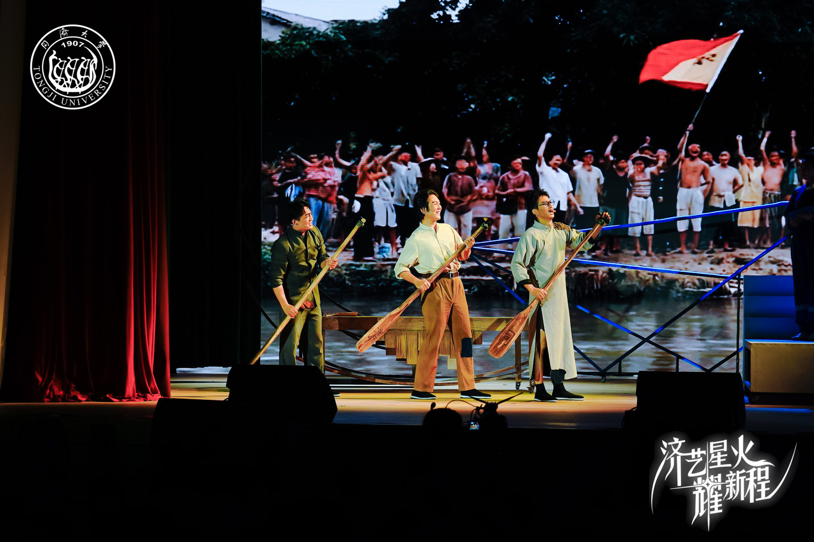 晚会正式启幕前,“同心律动”预热环节率先点燃全场热情。在“声浪领航员”的带领下,现场师生以歌曲接力的形式互动,让青春旋律在剧场内久久回荡,为“美育第一课”提前注入活力。“济忆·拾光追梦”“绽放·辉映星河”“征途·踏浪行歌”三个篇章层层递进,串联起十余个多元节目。第一篇章以“传承与启航”为核心,在学生音乐剧团带来的《歌舞青春》中拉开帷幕,学生舞蹈团《觉醒年代》《光亮》、学生合唱团《天下》及C4Family街舞协会等社团联合呈现的《“济”刻电波》串烧,尽显青春张力、历史厚重与校园文化丰富性。第二篇章聚焦“精神传承与青春表达”,《国家宝藏》团队编排的舞台剧《同济宝藏之同济号》、串烧《济给你的一首歌》、情景朗诵《四海同舟,青春向党》,兼具思想深度与情感共鸣,传递使命感。第三篇章围绕“奋进与展望”,学生民乐团《嚯哈·世间始终你好》、民族学生艺术团《再唱山歌给党听》、学生合唱团及各学院合唱基地联合呈现的《灯火里的中国》,尽显文化自信与团结力量,将晚会气氛推向高潮。