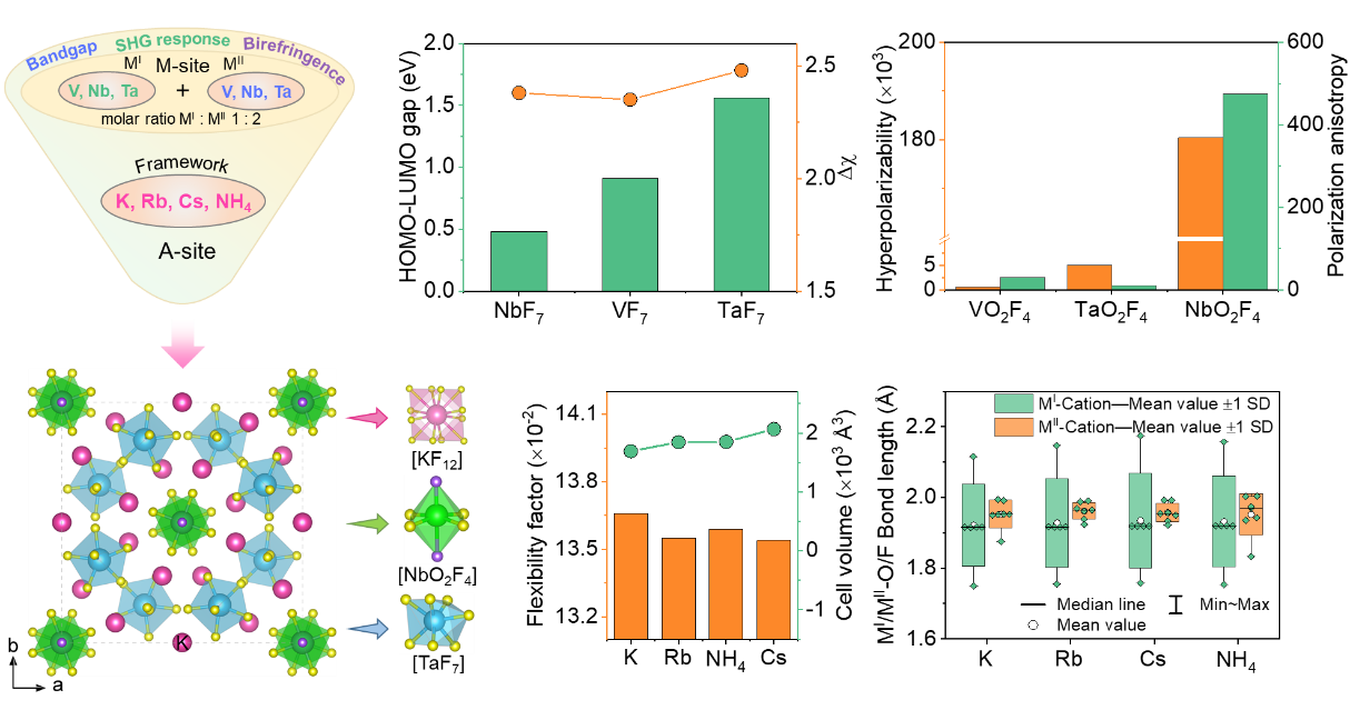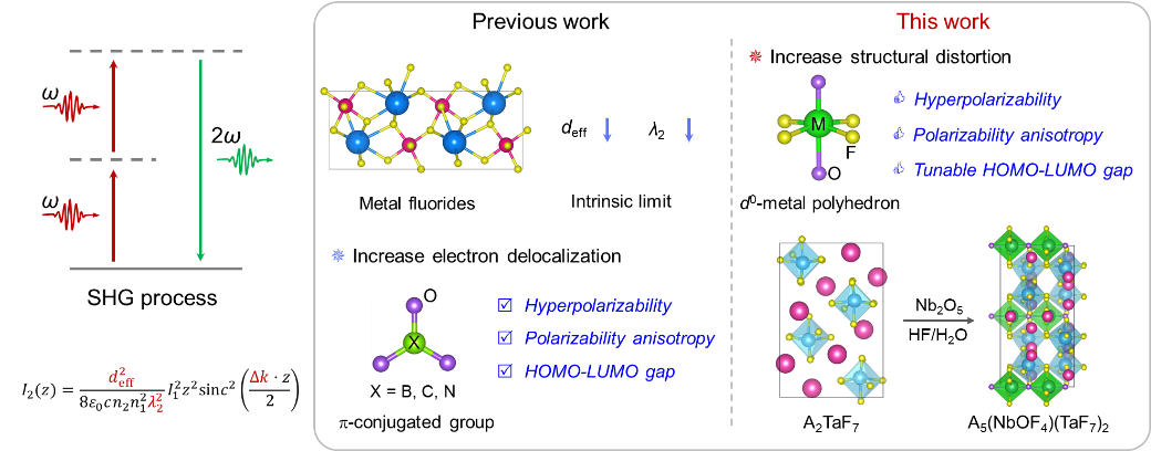 近日,欧洲科学院院士、德国国家工程院院士、同济大学化学科学与工程学院张弛教授研究团队在混合d0过渡金属二阶非线性光学晶体材料研究中再获重要进展,实现了二阶非线性光学晶体材料深紫外透明度/非线性光学性能权衡的新突破。同济大学化学科学与工程学院研究团队与中科院北京理化技术研究所和澳大利亚国立大学等单位研究团队紧密合作,利用第一性原理计算对过渡金属氟化基元进行筛选,采用协同双位点策略,合成了首例深紫外透过且能够通过四次谐波产生输出266 nm倍频光的混合d0过渡金属材料A5(NbOF4)(TaF7)2 (A = K, Rb, Cs, NH4),探讨并阐明了受控氟化基元对晶体材料光学性能的调控机制。相关研究成果以“Breaking the Deep-UV Transparency/Optical Nonlinearity Trade-Off: Three-Parameter Optimization in Oxyfluorides by Tailoring d0-Metal Incorporation” (打破深紫外透明度/非线性光学的权衡:通过调控d0金属掺入优化氧氟化物的三个参数)为题,日前以全文(Research Article)形式发表于国际化学、材料顶级权威学术期刊《德国应用化学》(Angewandte Chemie International Edition),并被编辑委员会遴选推荐为当期的封面文章(Inside Front Cover)和热点论文(HOT Paper)。