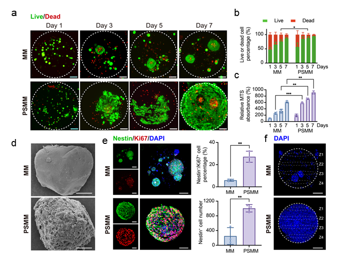 研究团队首先使用双水相体系(海藻酸钠/聚乙烯醇)结合气体剪切微流控的方式高通量制备了大小可控且具有微米级孔隙的微凝胶。实验结果显示,相较于纳米级孔隙微凝胶(MM),微米级孔隙(PSMM)能显著提升NPCs的密度、分布均匀性及活性,从而提高细胞负载能力。