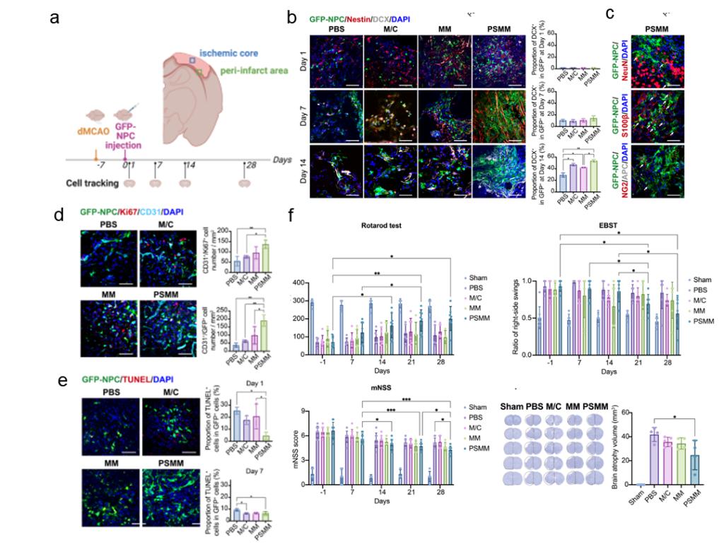 图3. 负载NPCs的PSMM-基质复合支架促进大鼠卒中后损伤修复