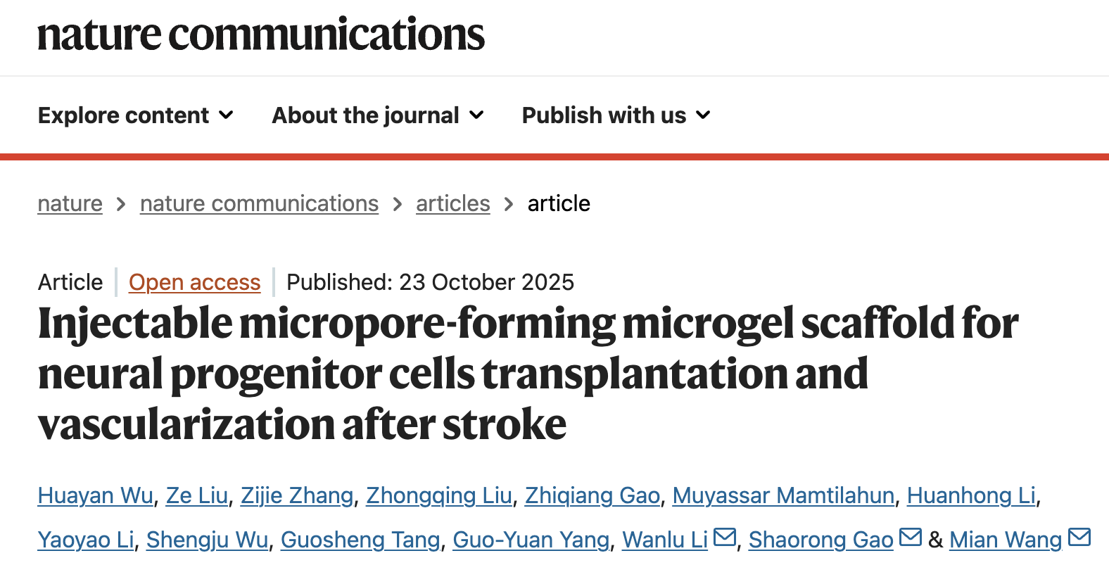 生命科学与技术学院王冕/高绍荣/李婉露团队合作开发可注射多孔微凝胶突破卒中干细胞治疗瓶颈,成果发表于《自然·通讯》