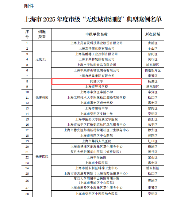 近日,上海市生态环境局公布2025年度市级“无废城市细胞”典型案例名单,同济大学荣获“无废校园”称号。这标志着同济在生态文明建设方面取得系统性实践与创新性成果,也为上海市“无废城市”建设贡献了“同济经验”与“高校样本”。
