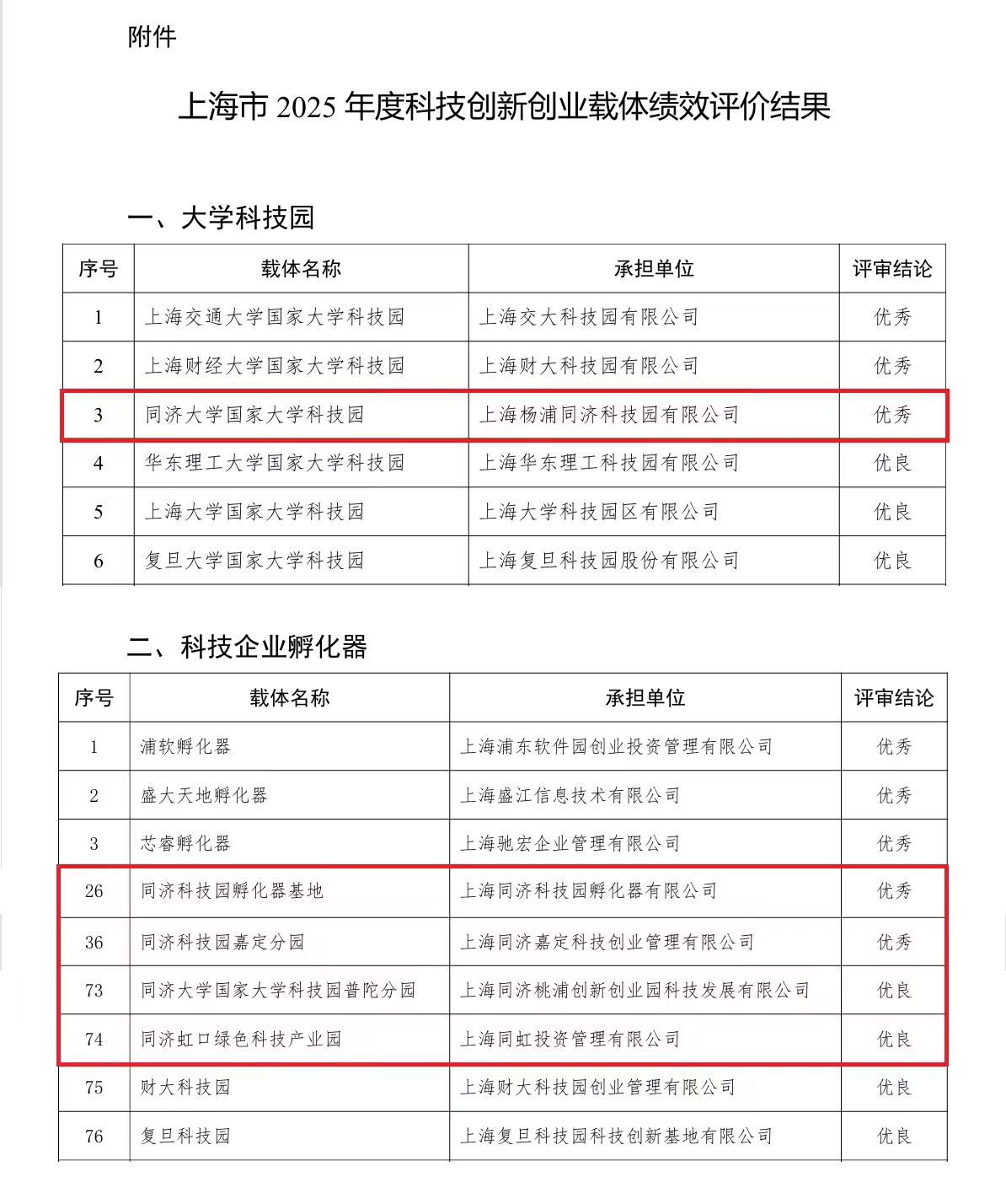 同济大学科技园及各园区在2025年度上海市科技创新创业载体绩效评价中蝉联佳绩