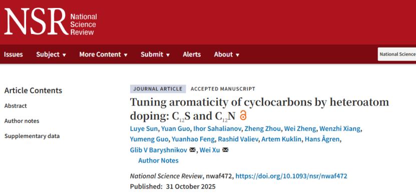 10月31,《国家科学评论》(National Science Review)在线发表了同济大学材料科学与工程学院许维教授团队与瑞典林雪平大学、芬兰赫尔辛基大学及瑞典乌普萨拉大学等国际合作团队的最新科研成果“Tuning aromaticity of cyclocarbons by heteroatom doping: C12S and C12N”。该研究利用扫描探针显微技术成功合成了两种杂原子掺杂的环型碳:C12S(硫掺杂环型碳)和C12N(氮掺杂环型碳),并结合理论计算揭示了它们在芳香性上的根本差异。