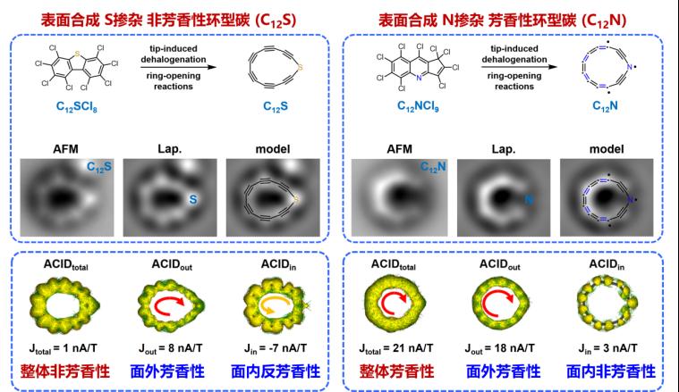 许维教授团队提出了一个大胆的思路:如果在环型碳里加入一个外来原子,比如硫或氮,会不会打破这种双重特性,让芳香性变得可以调节?他们设计了两种含有硫或氮的全卤代前体分子,然后利用扫描探针显微镜的针尖操纵技术,在超低温表面上一步步去除卤素原子并诱导前体分子发生反伯格曼开环反应,最终合成单个硫和氮原子掺杂的环型碳:C12S与C12N