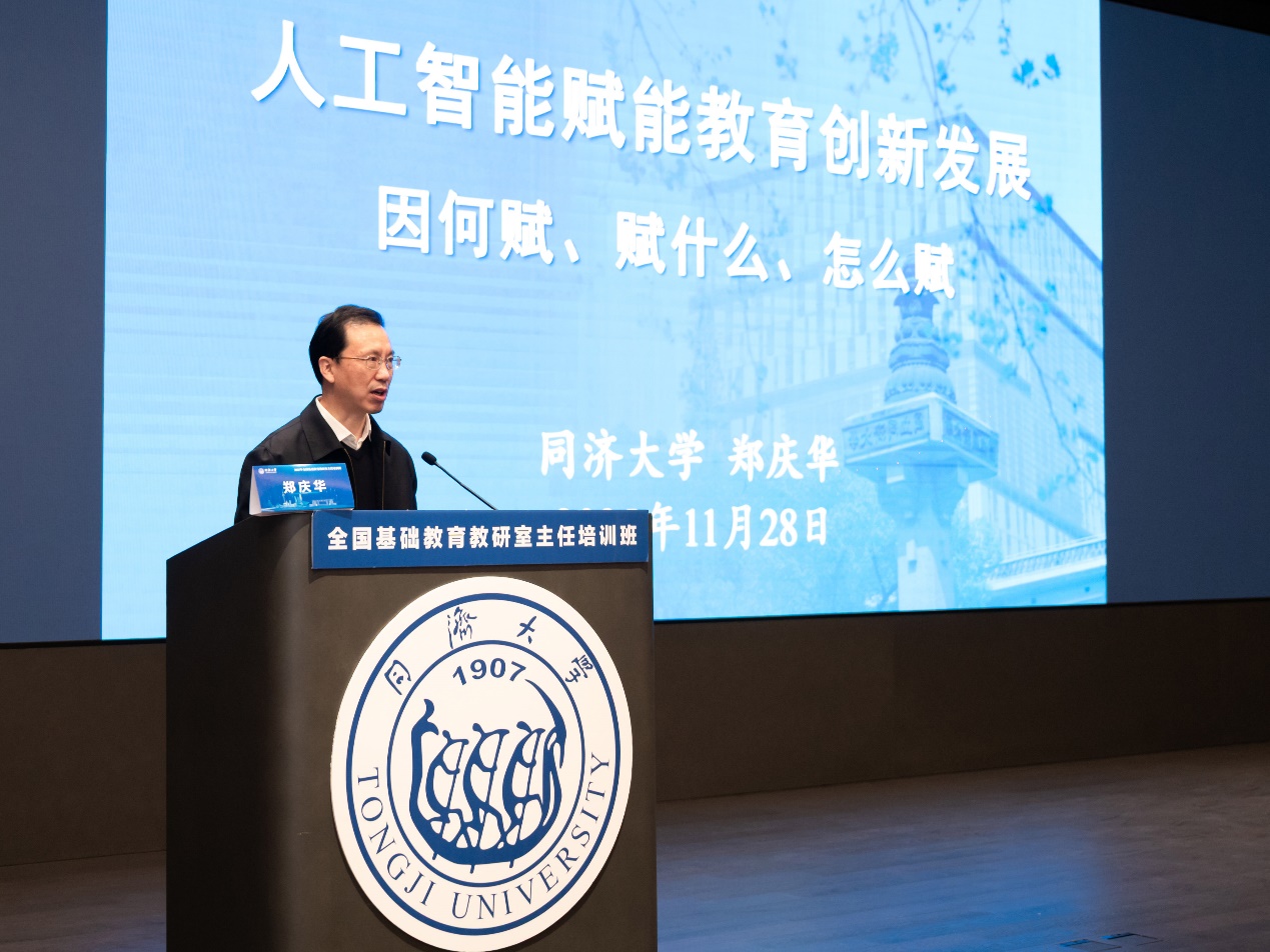 作为培训班的一讲,校党委书记、中国工程院院士郑庆华为培训班全体学员作了题为《人工智能赋能教育创新发展——因何赋、赋什么、怎么赋》的专题报告。郑庆华围绕“时代之问:因何赋能?”“理念内涵:赋能什么?”“同济方案:怎么赋能?”三个维度展开系统阐述,从人类文明发展与科技革命视角出发,分析了AI总体发展趋势,提出了重塑AI时代教育的必要性,并结合同济大学的实践经验,给出了人工智能赋能教育创新发展的行动方案。
