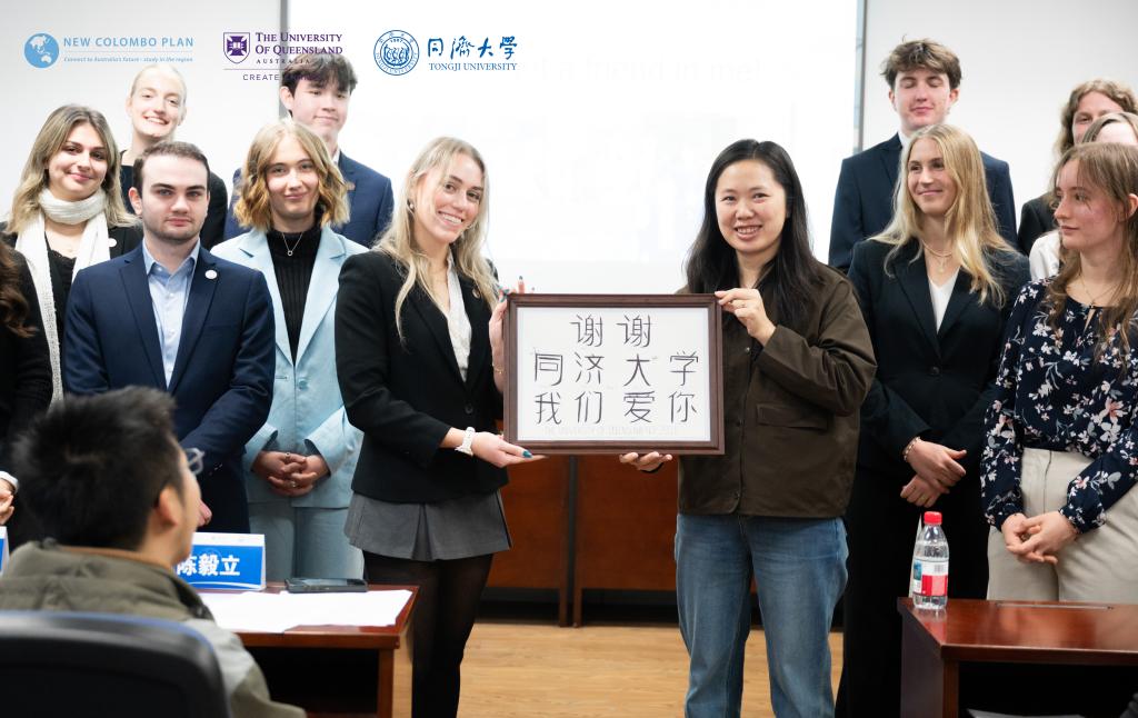 在12月19日举行的冬令营闭幕式上,全体与会人员共同观看了研学回顾短片,一幕幕学习、探索与交流的画面,将为期四周的丰硕旅程串联呈现。同济大学留学生办公室、测绘与地理信息学院负责人对昆士兰大学师生全程的积极参与、深度思考与开放交流予以高度赞誉,勉励大家将此次跨学科交融、跨文化碰撞的学习体验,转化为深化学术探索、联结国际合作的持久动力。闭幕式上颁发给营员们的证书为他们的上海研学之旅镌刻下圆满印记。昆士兰大学学子也用自己独特的方式表达了对同济大学的深情感谢,他们亲笔书写中文毛笔字“谢谢 同济大学 我们爱你”,以笔墨传递心意,并共同唱响《You’ve got a friend in me》,用悠扬旋律诉说跨国旅程中的深情厚谊。