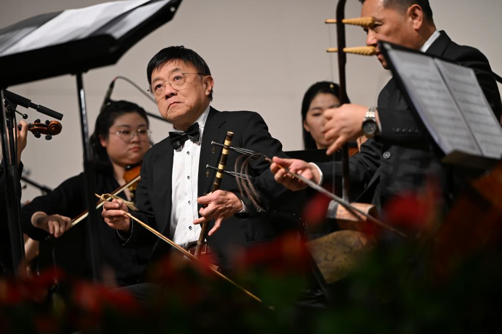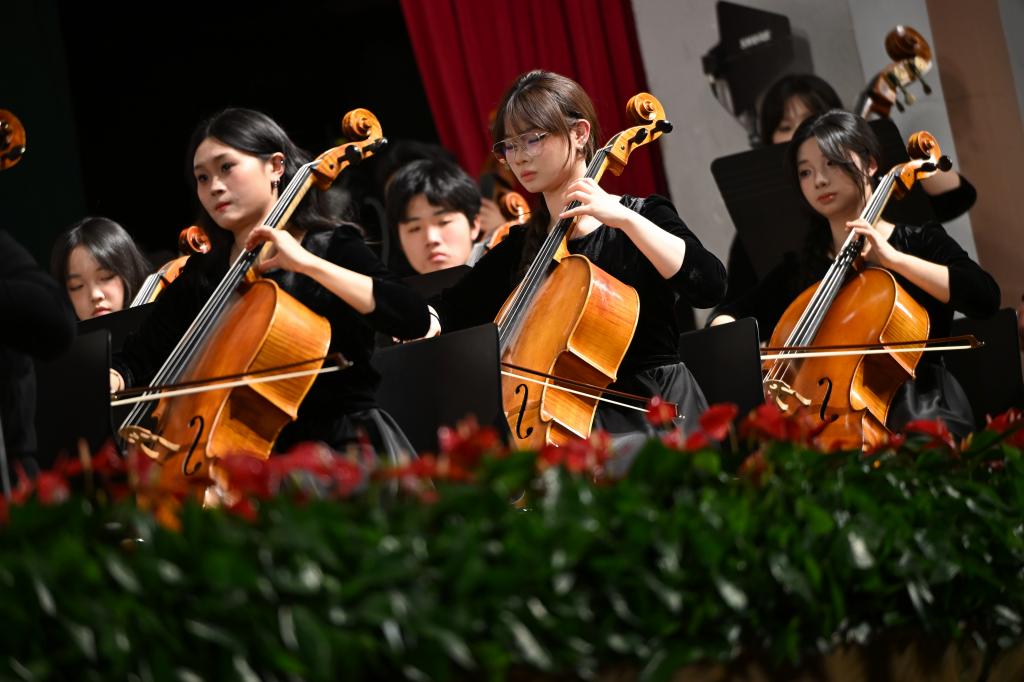 管弦乐合奏《花好月圆》《法兰多拉舞曲》《乡村骑士》《波莱罗舞曲》《电闪雷鸣波尔卡》,小提琴协奏曲《梁祝》……管弦声声诉真情,一曲曲悦耳动听的经典旋律动人心弦,将现场听众带入到欢乐喜庆的迎接新年氛围中。一曲终了,掌声四起。