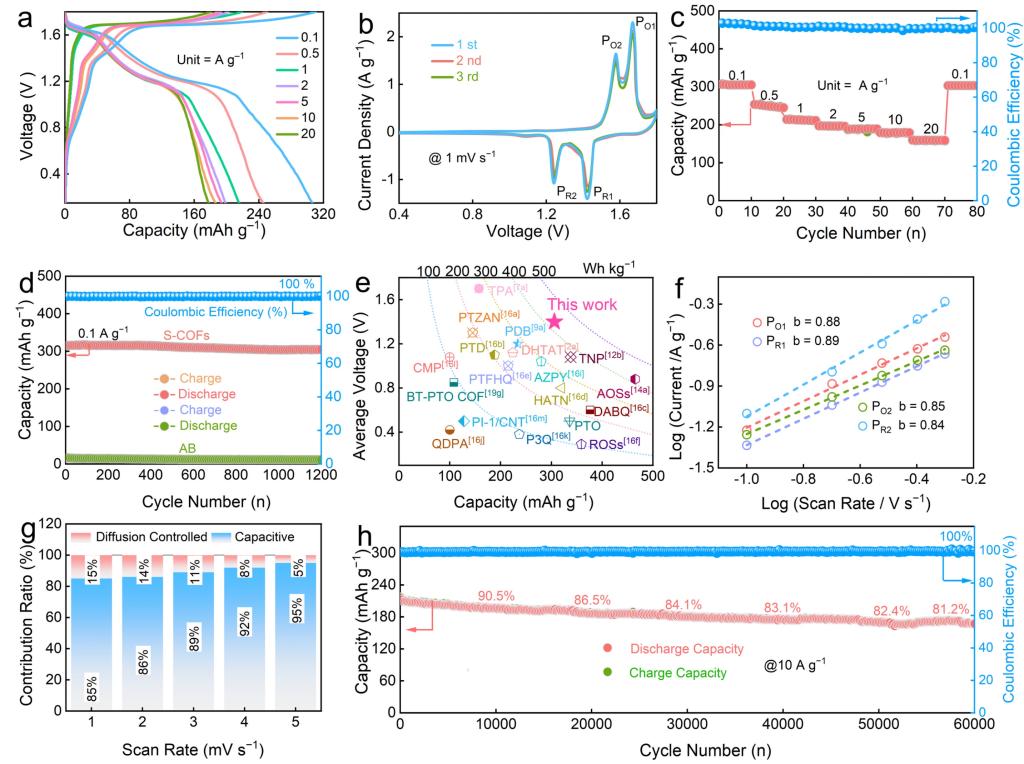 S-COFs正极材料用于锌-有机电池时,表现出高比容量(310 mAh g−1)、高能量密度(403 Wh kg−1)和长循环稳定性(60,000次充放电后容量保持率为81.2%)。