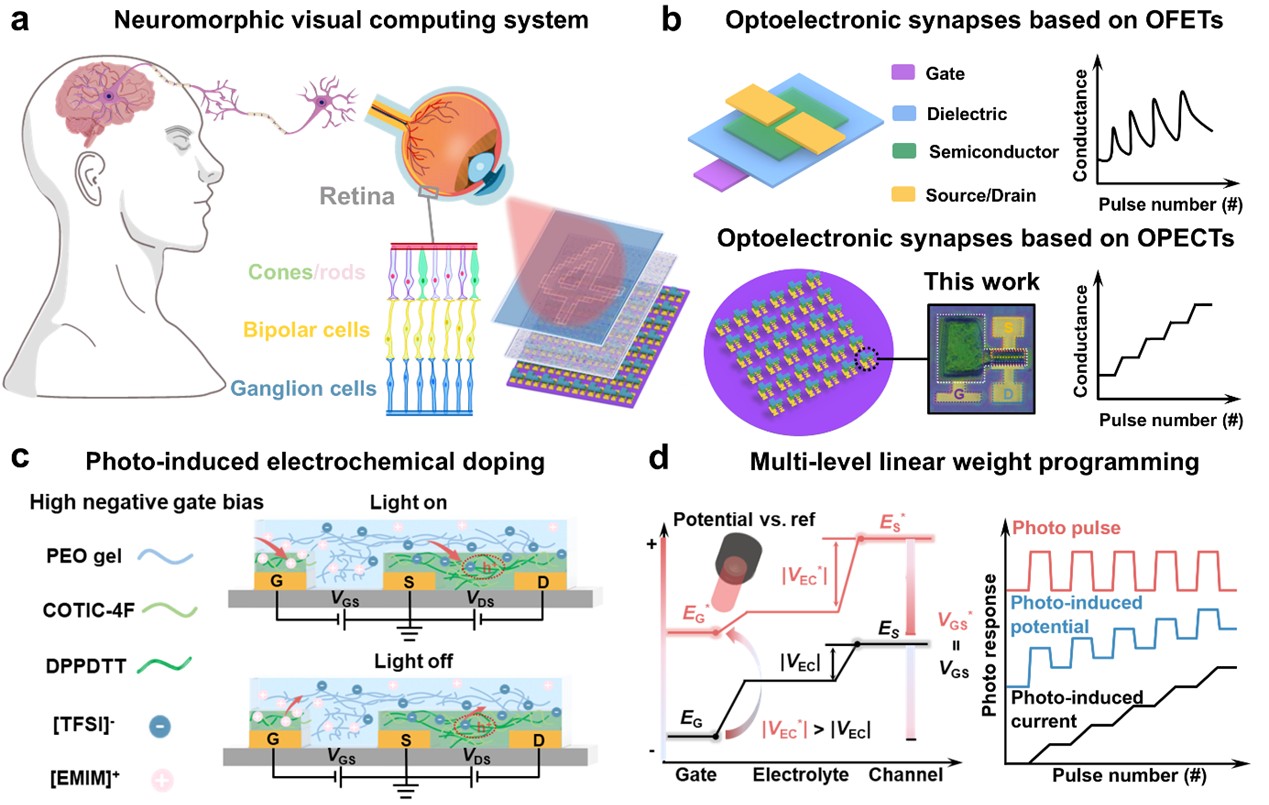 近日,材料科学与工程学院黄佳教授团队在有机晶体管感知器件领域取得进展,《自然·通讯》(Nature Communications)在线发表了团队题为“Near-infrared organic photoelectrochemical synaptic transistors by wafer-scale photolithography for neuromorphic visual system”的研究论文。