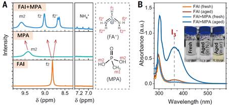 图、PA-SAMs与钙钛矿材料中的(A)有机阳离子和(B)碘离子发生化学反应导致其降解