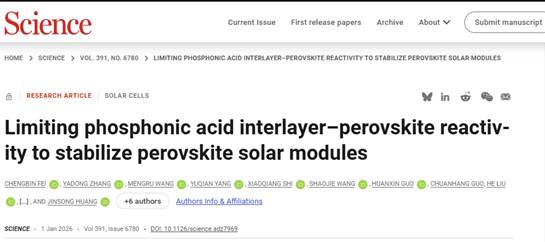 1月1日,材料科学与工程学院费成斌研究员在加盟同济大学前于美国北卡罗来纳大学开展博士后研究工作所取得的突破性成果,以“Limiting phosphonic acid interlayer-perovskite reactivity to stabilize perovskite solar modules”为题在国际顶级学术期刊《科学》(Science)在线发表。