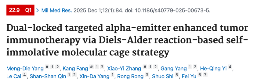 近日,同济大学核医学研究所余飞教授团队在《军事医学研究(英文)》(Military Medical Research)上发表题为“Dual-locked targeted alpha-emitter enhanced tumor immunotherapy via Diels–Alder reaction-based self-immolative molecular cage strategy”的论文。该研究利用逆电子需求狄尔斯-阿尔德(IEDDA)点击化学反应驱动的自裂解分子笼策略,实现223Ra肿瘤部位特异性“解锁”,并从内质网应激—免疫原性细胞死亡(ICD)—免疫检查点调控的路径解析其α辐射免疫效应,同时建立了初步剂量学框架,为新一代靶向α核药的设计与评价提供了可参考的技术路径。