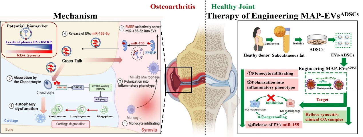 2月17日,同济大学医学院、附属东方医院徐俊教授团队在《骨研究》(Bone Research)在线发表了题为“Synovial inflammatory macrophage-derived extracellular vesicles exacerbate cartilage lesions with a FMRP-selectively sorted manner in osteoarthritis”的研究成果。该研究首次证实OA早期骨髓MNs源外泌体(EVs)整合性驱动KOA病理进展:滑膜炎症、软骨退变和关节疼痛等;研发了精准靶向炎性MNs的工程化外泌体载药装置,可显著缓解临床OA样本的滑膜炎症;同时发现OA早期诊断的潜在靶点——血浆外泌体FMRP蛋白,为骨关节炎的诊疗提供新策略。