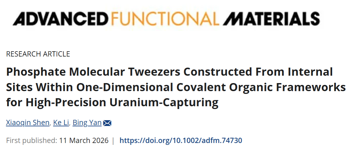 近日,化学科学与工程学院闫冰教授团队通过对含羟基官能团的1D COFs进行磷酸化修饰,成功在COFs的孔道内构建了铀酰(UO22+)特异性纳米陷阱,实现了对其精准捕获,相关成果以“Phosphate Molecular Tweezers Constructed From Internal Sites Within One-Dimensional Covalent Organic Frameworks for High-Precision Uranium-Capturing”为题在线发表于《先进功能材料》(Advanced Functional Materials)。