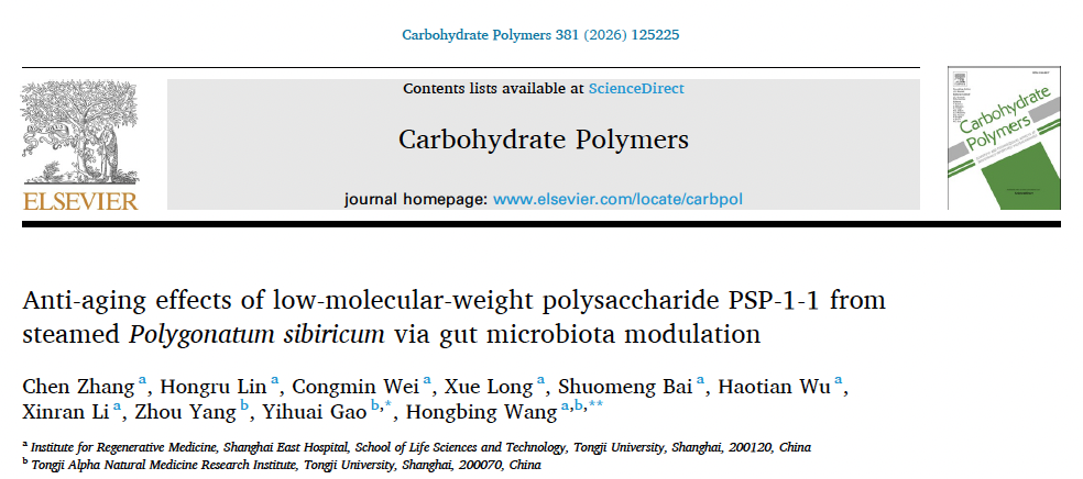 3月21日,同济大学生命科学与技术学院王红兵教授课题组在《碳水化合物聚合物》(Carbohydrate Polymers)上发表题为“Anti-aging effects of low-molecular-weight polysaccharide PSP-1-1 from steamed Polygonatum sibiricum via gut microbiota modulation”的研究论文,系统揭示了经“九蒸九晒”炮制后的黄精来源低分子量多糖PSP-1-1在结构特征、抗衰老活性及肠道菌群调节方面的多重功能。