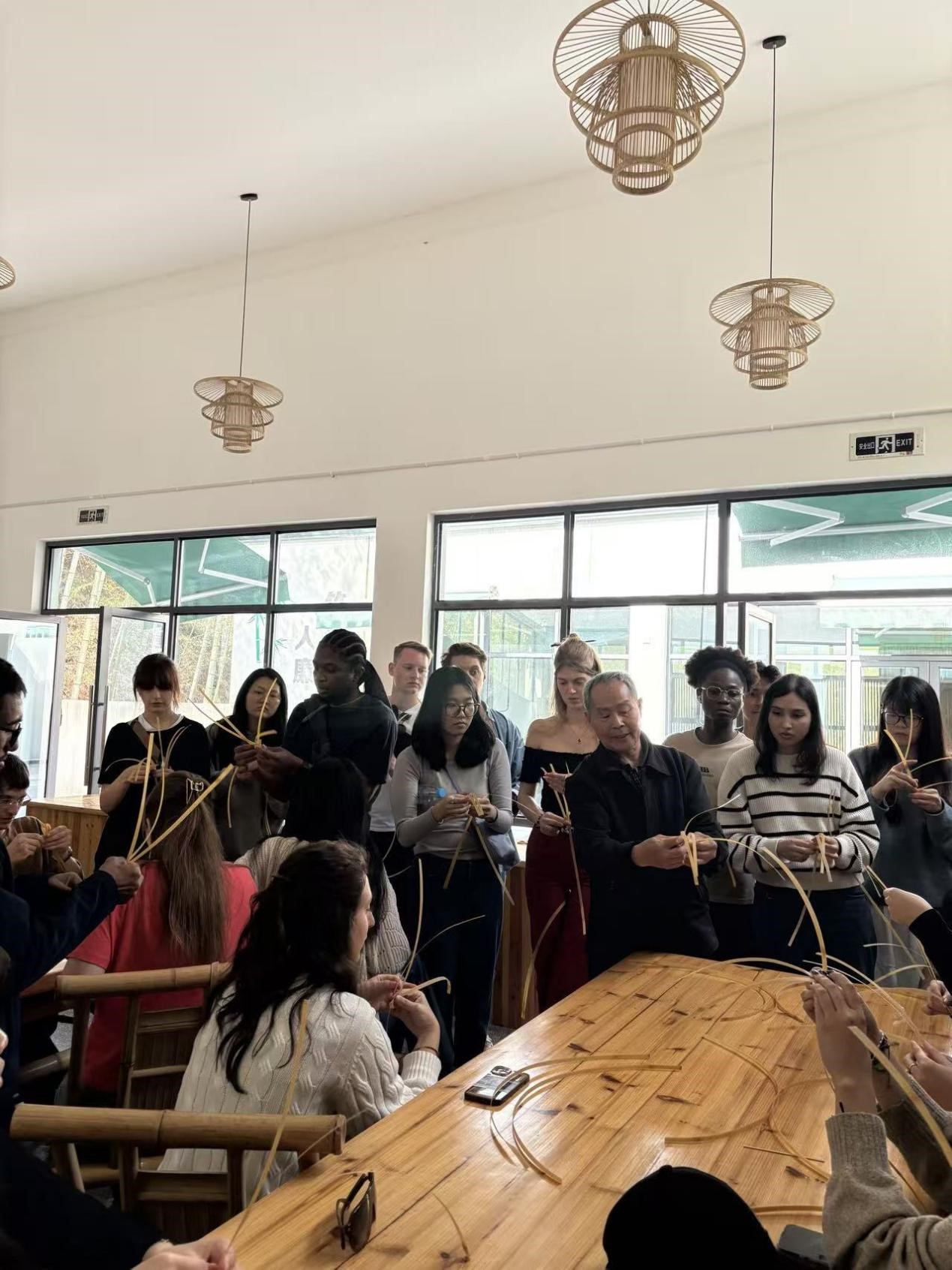 28日下午,国际学生们前往电影《卧虎藏龙》的拍摄地——木坑竹海,在葱郁竹海间体验竹编技艺。篾匠师傅现场演示了竹编小鸟的制作流程。劈竹、起篾、编织,工序虽然繁复,却在专业指导下被学生们逐一掌握。当一只只灵动的竹编小鸟在手中成形,大家不仅收获了手作的成就感,更领略到中国传统竹艺“化竹为器、以器载道”的匠心智慧。