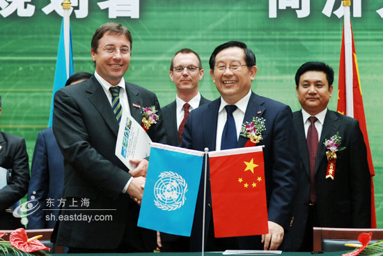 东方网实习记者霍世杰、曹子琛报道:今天上午8点40分,联合国副秘书长、联合国环境规划署执行主任施泰纳(Achim Steiner)先生,中国科技部部长、同济大学校长万钢,分别代表联合国环境规划署、同济大学为双方共建的“联合国环境规划署—同济大学环境与可持续发展学院”续签合作协议。