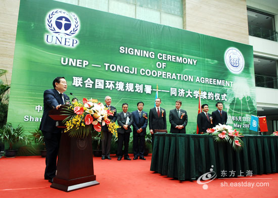 图片说明:上午8点40分,在同济大学嘉定校区,联合国环境规划署与同济大学举行签约仪式。