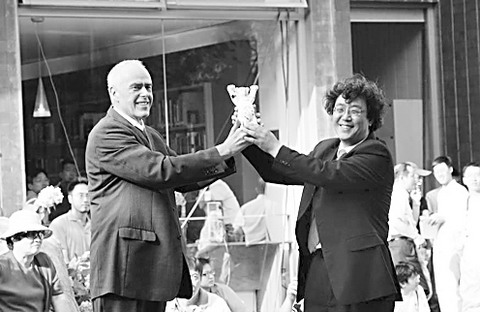 图为赫勒教授向同济大学建筑与城规学院院长吴志强转交“同济”柏林熊模型。