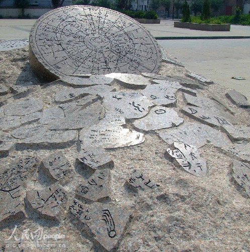 象征中华文明起源的雕塑小品“开乾”“创坤”。这两座安装在甘肃天水伏羲广场上的雕塑小品各重30吨,由同济大学设计、制作。 “开乾”雕塑上刻有星象图的天盘、纪录发现彗星、新星的甲骨文残片,以星移斗转象征中华文明悠远的历史。“创坤”上刻有的彩陶罐为天水周边地区出土、并在中华文明史上占有重要地位的文物,其中的鲵鱼纹又称龙纹,是中华龙图腾的起源形象,以龙的演变象征中华文明地域空间的拓展。 人民网2007-8-15
