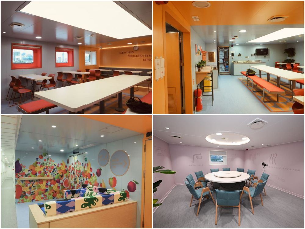 “同济”号在2000吨级船舶平台基础上通过优化布局,实现了460平方米甲板作业区域、320平方米实验室区域、人均10.2平方米居住舱室以及总计百余平方米的会议区、阶梯教室、休闲区、健身区等舱室,以较小的体量实现了3000吨级科考船的作业能力。