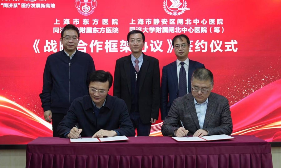 在上海市卫生健康委二级巡视员吴宏、静安区卫生健康委主任陈磊、同济大学医政医管处副处长徐磊共同见证下,同济大学附属东方医院院长陈义汉与静安区闸北中心医院院长张少觐共同签署了《战略合作框架协议》。