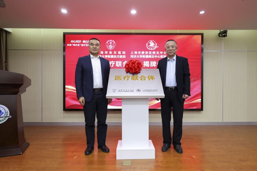 同济大学附属东方医院党委书记李明、静安区闸北中心医院党委书记刘旭能共同为合作医院揭牌。