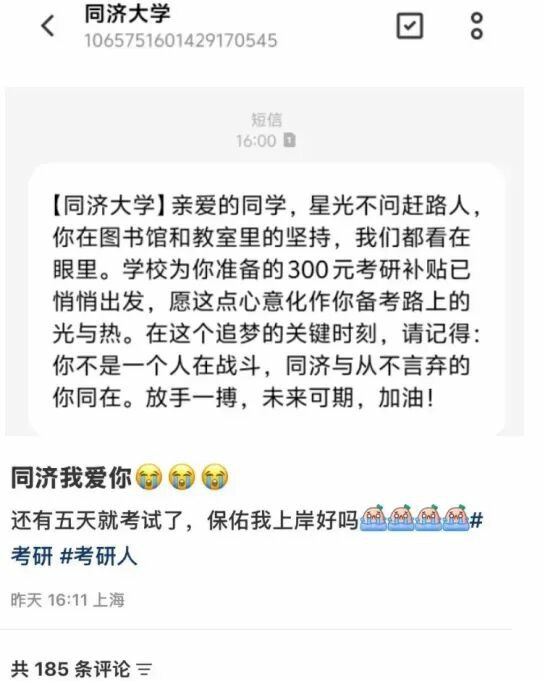 “我的卡里突然多了300元!”近日,“同济悄悄给考研人打钱”被同学们晒到社交平台。“太暖了”!这份主动出击的默默关心引发广泛关注。今年,同济大学继续开展隐性考研补贴资助工作,向助学成才服务对象中的考研学子直接发放考研补贴,打入学生银行卡中,并通过短信方式提醒学生查收,助力同学们圆梦未来。