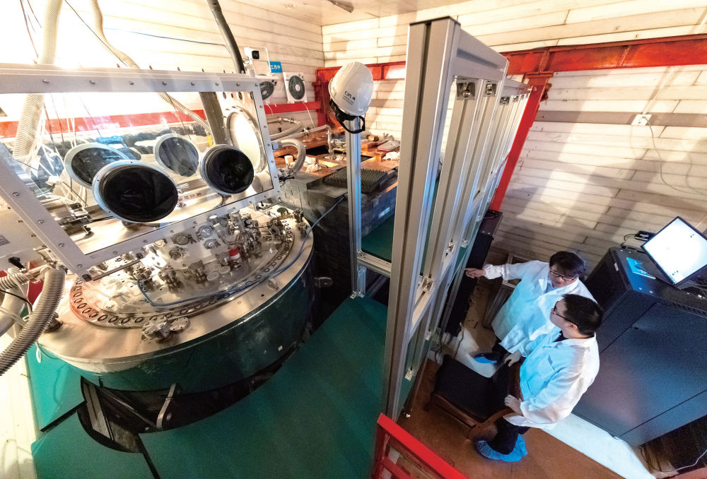 2023年7月3日,在中国锦屏地下实验室,清华大学杨丽桃博士(左)与实验组成员聂奇缘讨论实验数据(沈伯韩/摄)