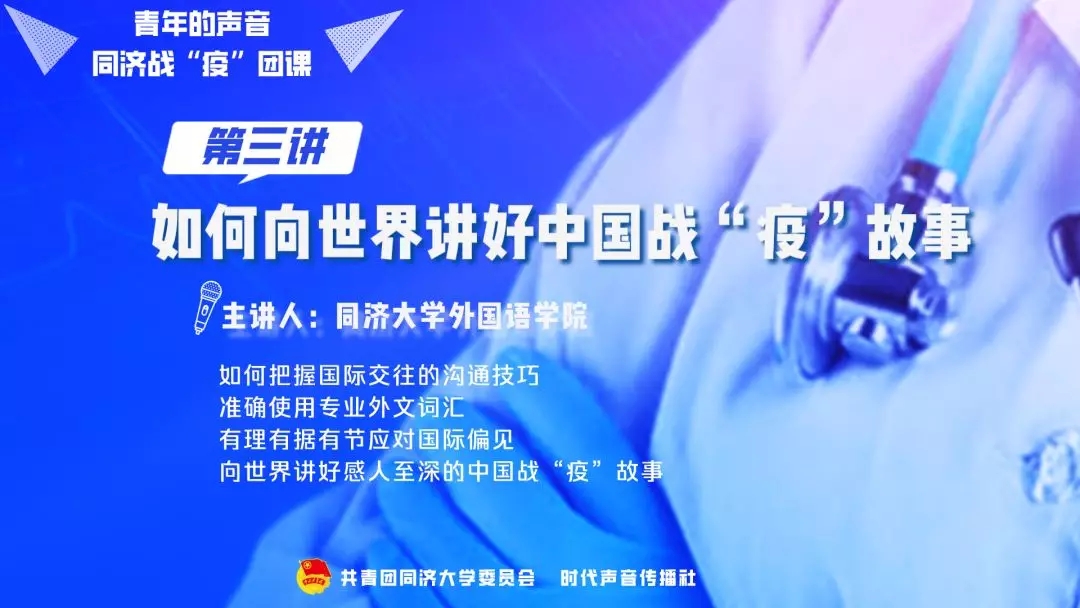 同济青年如何向世界讲好中国的战“疫”故事?同济战“疫”系列线上团课第三讲于3月20日15:00在哔哩哔哩直播间举行。本次团课由校团委联合时代声音传播社、外国语学院共同举办,邀请到外国语学院黄立鹤、郭靓靓、...