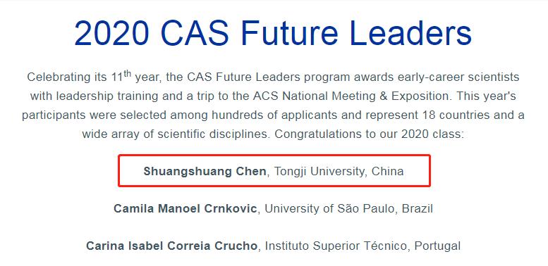 化学科学与工程学院博士后研究人员陈双双入选2020年“CAS未来领袖”