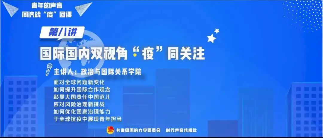 同济战“疫”系列线上团课第八讲——国际国内双视角“疫”同关注于4月3日15:00在B站直播间举行。本次团课由校团委联合时代声音传播社、政治与国际关系学院共同举办,邀请到政治与国际关系学院刘笑阳、葛天任两位...